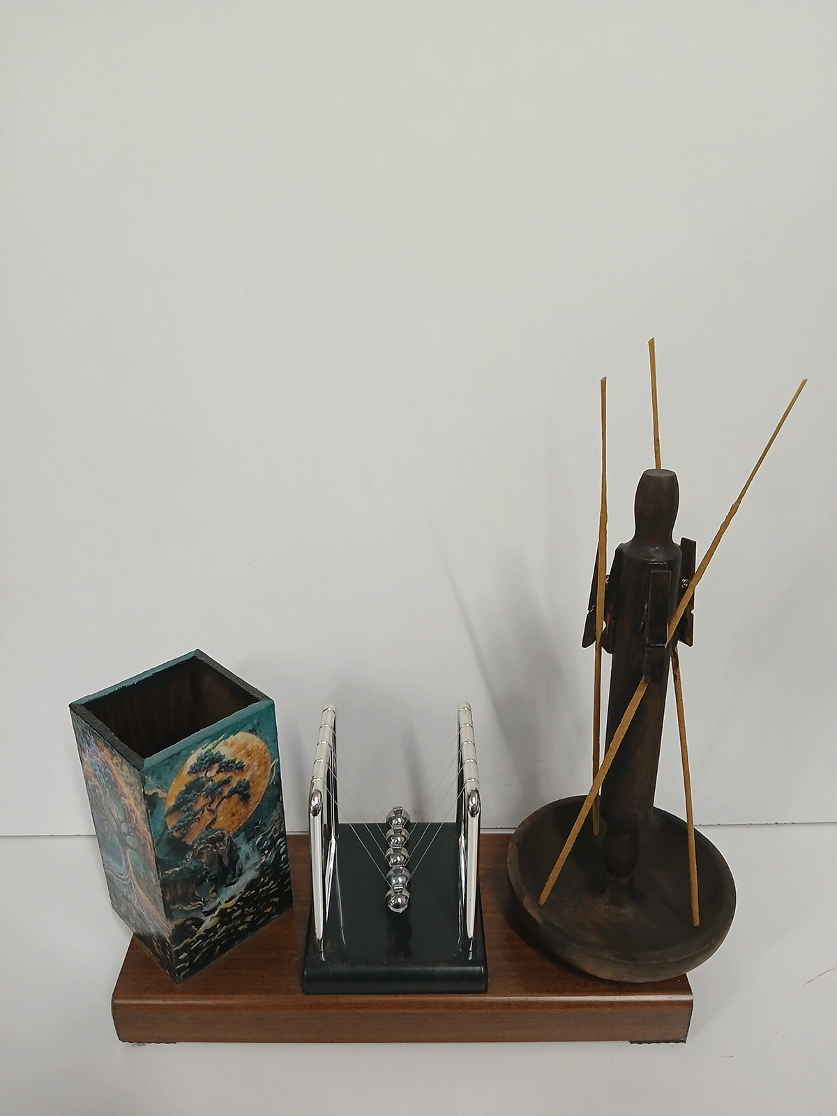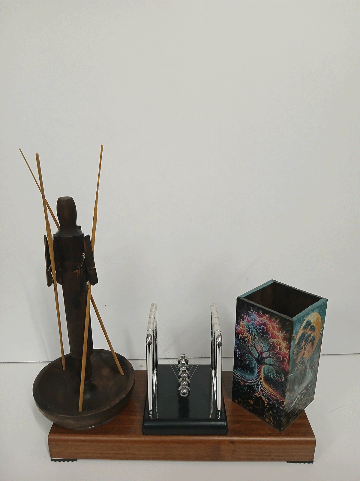 Μια διακοσμητική σύνθεση που ζωντανεύει τις αισθήσεις: οι μπάλες χτυπούν η μία την άλλη σε έναν αέναο, ρυθμικό χορό, ενώ η ξύλινη φιγούρα με τα αρωματικά στικ διαχέει απαλά το άρωμά της στον χώρο. Κάθε στοιχείο αλληλεπιδρά με χάρη, θυμίζοντας την ισορροπία και την αρμονία της φύσης. Το δέντρο στηρίζεται γερά στις ρίζες του και απλώνεται στον ουρανό, όπως η ζωή μας ενώνει το παρελθόν, το παρόν και το μέλλον, φέρνοντας δύναμη, φως και αρμονία σε κάθε στιγμή